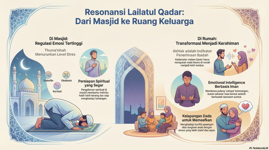 Dari sisi psikologi, seseorang yang punya pengalaman spiritual di masjid akan membantu dirinya untuk hadir lebih “fresh”. Saat seseorang merasakan ketenangan (thuma’ninah) di malam Qadar, otak melepaskan hormon endorfin dan oksitosin yang menurunkan level kortisol (stres). Secara teknis, individu tersebut sedang melakukan regulasi emosi di tingkat tertinggi. Akan tetapi, regulasi emosi yang sebenarnya bukanlah saat kita sendirian. Ujian akan terasa ketika sudah di rumah, saat menghadapi anak-anak yang sedang menangis, atau kita sedang berkonflik dengan pasangan.